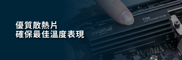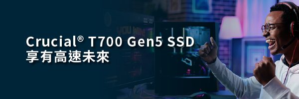 Crucial® T700 PCIe® 5.0 NVMe™ SSD提供高達 12,400/11,800MB/s 循序讀取/寫入速度(隨機讀取/寫入速度高達 1,500K IOPS)效能比 Gen4 SSD快將近2倍,以達成加快遊戲速度、影片編輯、3D渲染和繁重的工作負載應用程式的處理效率。