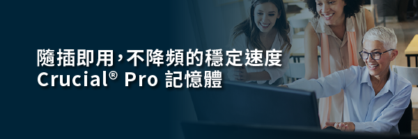 Crucial® Pro 系列桌上型電腦記憶體沒有手動超頻、調整時序、挑選顆粒、LED 光害等麻煩。提供時尚外型的矮版鋁製散熱器則負責散熱,穩定且不降頻的速度。