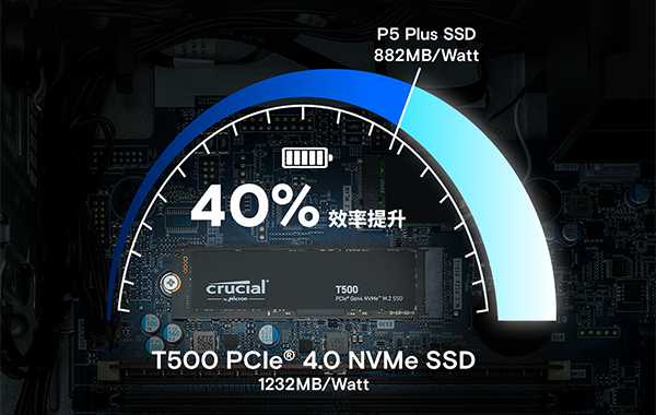 而在效能提升的同時,在功耗比更是有所提升,對比Crucial P5 Plus效能功耗比提升高達 40%,可幫助系統以更低的功耗更快速運作。出色的功耗比提升代表著更低的發熱量,在享受效能提升的同時,又可避免隱含的溫度牆問題。更適用於ITX主機、筆記型電腦等散熱環境受限,但又想享受高性能Gen4 SSD的使用者!