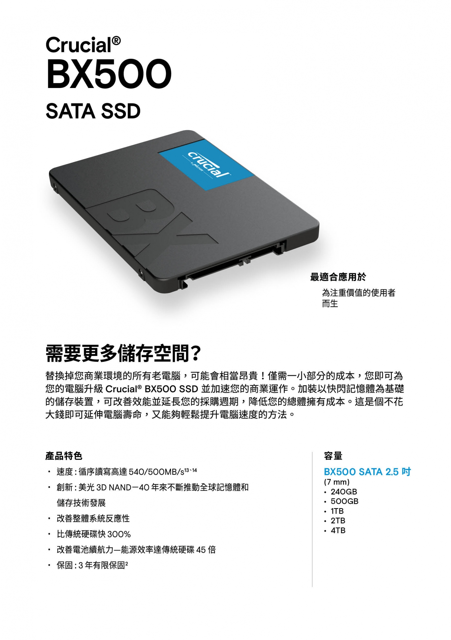 240GB、500GB、1TB、2TB、4TB